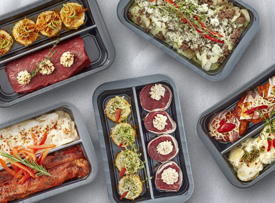 Bøf bearnaise på bund af kartoffel og porre Steges i forvarmet ovn 20-25 minutter ved 170°C varmluft. Retten opvarmes til minimum 75°C. Kan opvarmes direkte i bakken uden låg/film. Bakken er velegnet til ovn. 11995